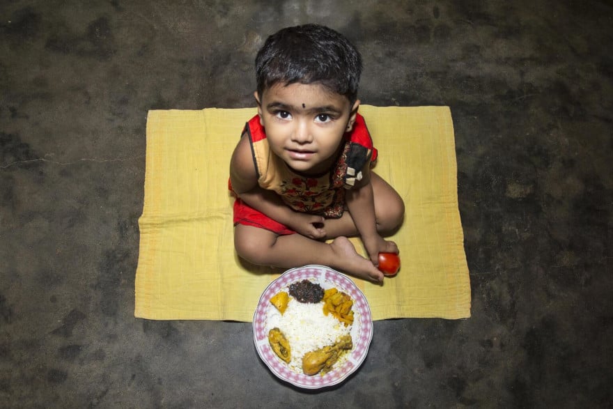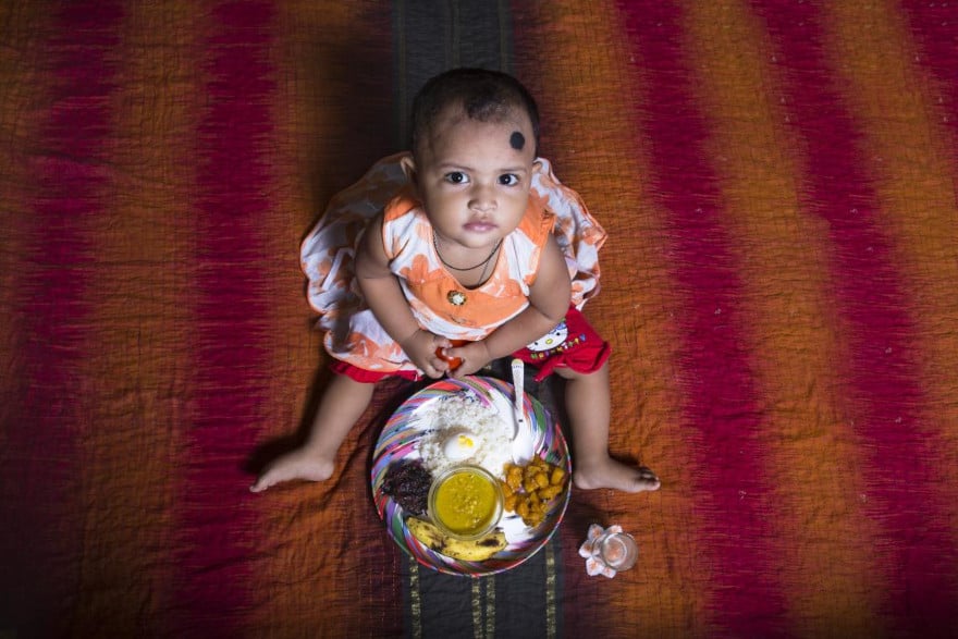 La cuchara llena de jaulo, una mezcla de arroz y lentejas, refleja la alegría de Girisha, de 3 años, que está a punto de comer su merienda en casa de sus abuelos en Ratnanagar, sur de Nepal. La merienda consiste en plátano, manzana y su plato de jaulo preparado por su madre.