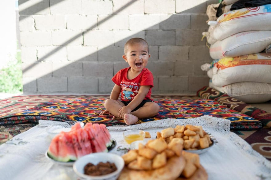 Nurayim, de 3 años, también vive en Kurshab. Le gusta comer avena. Su madre nos cuenta que la familia hace todo lo posible por evitar aquella alimentación que no es saludable, y que tienen la suerte de contar con un jardín donde pueden plantar algunas verduras.