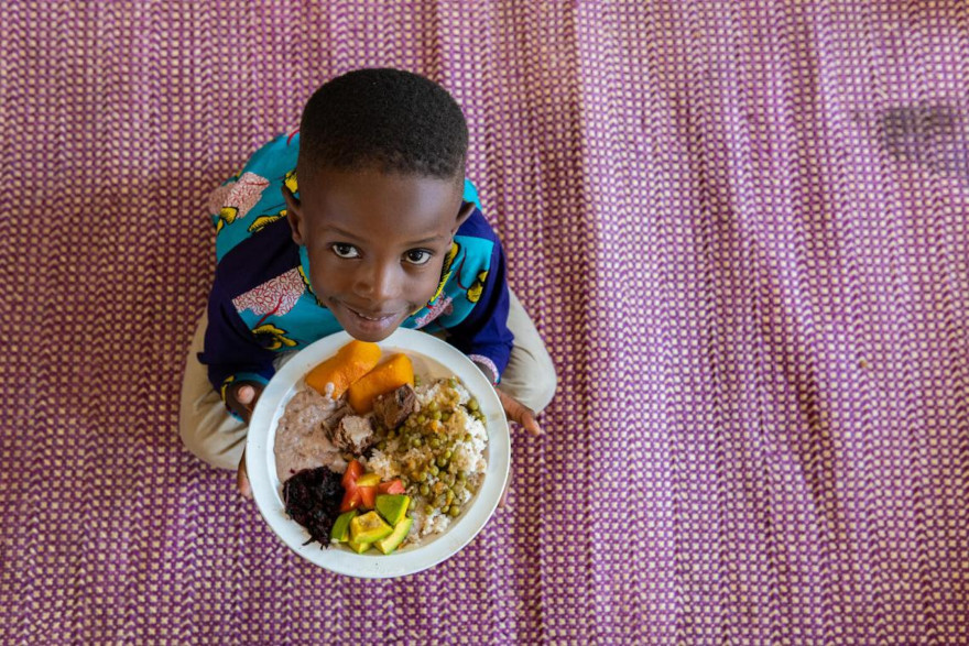 Daniel, de 5 años, también es de Uganda. Su plato de comida es muy variado, incluye calabaza, arroz, salsa de cacahuete, verduras rojas, aguacate, guisantes y carne.