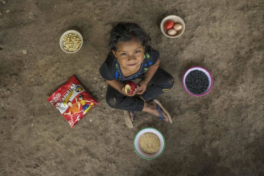 Jessica Domingo, de 5 años, también vive en Colotenango, Guatemala. Además de la manzana que tiene entre manos, vemos otros platos a su alrededor como frijoles, maíz, arroz, tomates, huevos e Incaparina (una mezcla de harina de maíz y harina de soja fortalecida con vitaminas y minerales, que se utiliza como un suplemento alimentario).