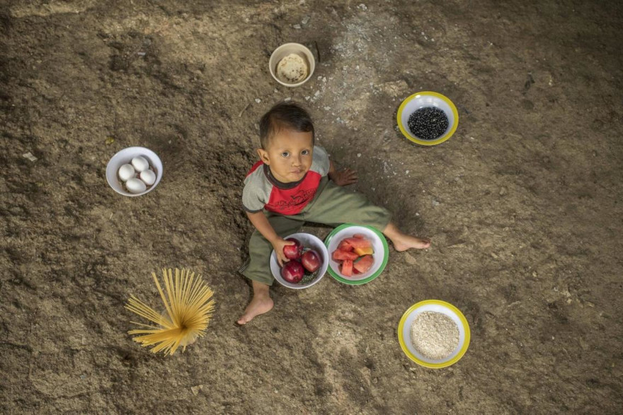 Hender Jonathan es un bebé de 23 meses. Desde el patio de su vivienda familiar en Colotenango, Guatemala, se prepara para comer una manzana. A su alrededor podemos ver tortillas, arroz, tomates, huevos, pasta, fruta y frijoles, todos alimentos que su madre utiliza para preparar sus comidas. "A veces me resulta complicado alimentar a mi hijo de manera saludable, por la falta de recursos y la distancia que hay hasta el mercado", dice su madre.