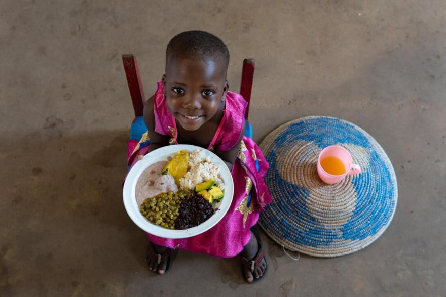 Nakalema tiene 3 años. Desde su silla preferida en su casa de Uganda, nos enseña su plato con arroz, matooke (puré de plátano), pasta de cacahuete, verduras de hoja, aguacate y guisantes.
