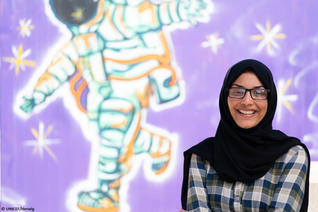 Aya aprendió a programar con el apoyo de UNICEF. "Me entristece que solo unas pocas niñas busquen trabajos de programación. ¡A través de la programación, podemos construir robots capaces de detectar minas y salvar vidas!", nos cuenta.