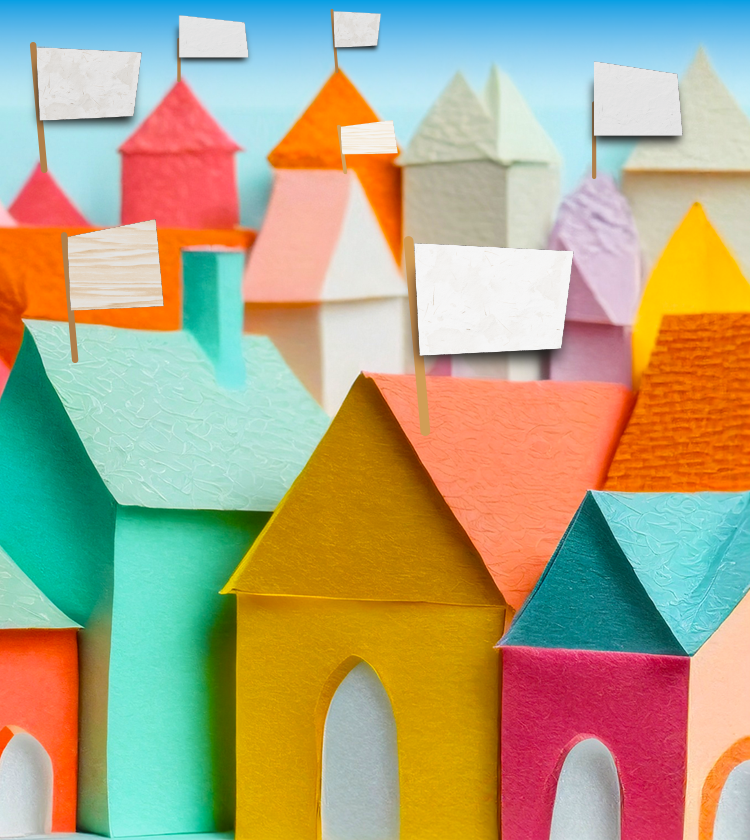 Ilustración que muestra un pueblo con banderas blancas sobre los tejados