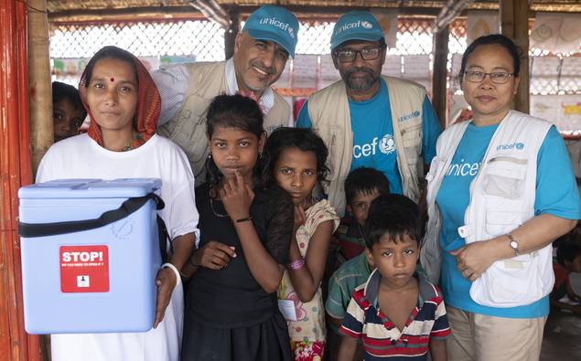 UNICEF presta servicios de salud en los centros de atención primaria y en los situados en los campamentos rohingya para las niñas, niños y personas con discapacidad además de apoyar campañas de vacunación según su calendario establecido. UNICEF apoya operaciones en los centros de tratamiento de diarrea en varias zonas del país.