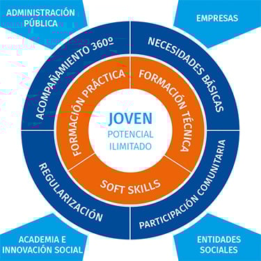 El modelo sitúa a las y los jóvenes en el centro y pone en acción al sector privado, sector público, organizaciones sociales y Academia.
