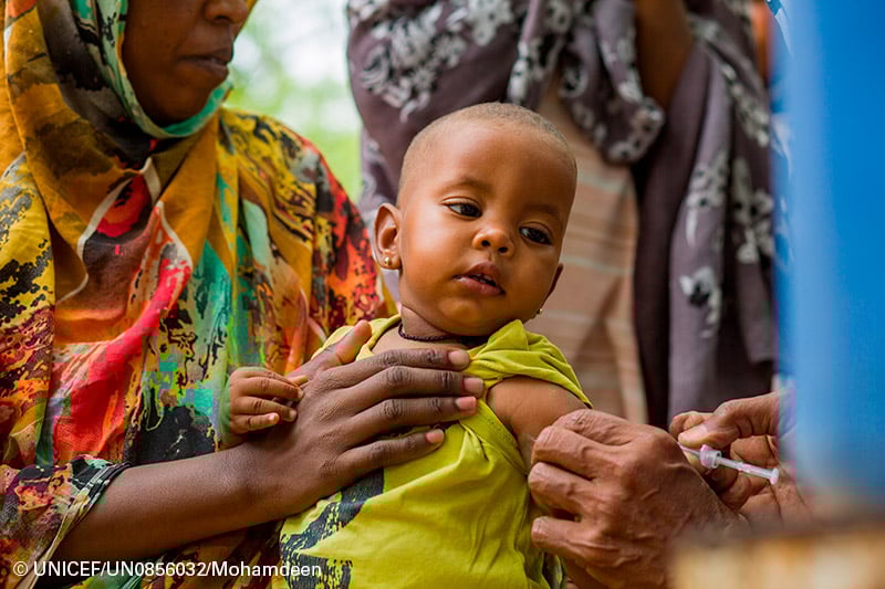 Vacunación por parte de personal de UNICEF en un centro para desplazados por el conflicto.