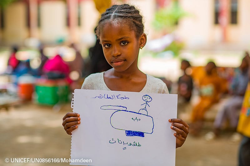 Fatima muestra un dibujo de un tanque en una sesión de apoyo psicosocial en un centro atendido por UNICEF.