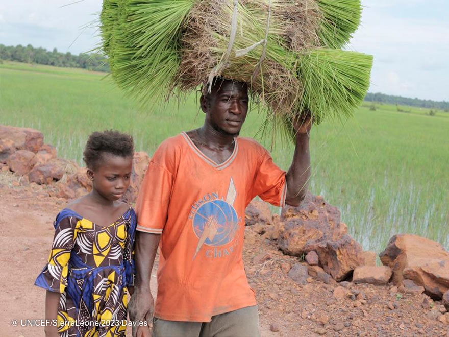 Salay camina junto a su padre y le ayuda con la cosecha.