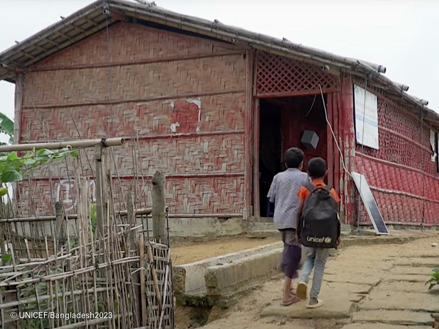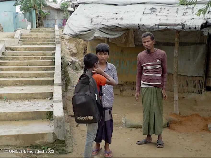 Los dos amigos llegan al centro de aprendizaje de Cox’s Bazar con la mochila de UNICEF.