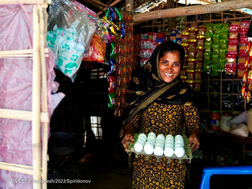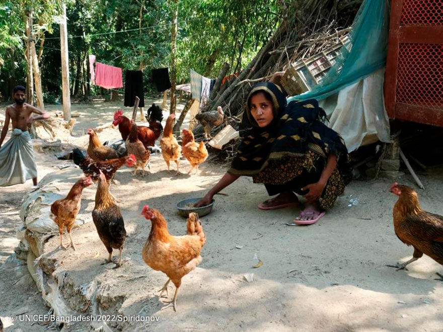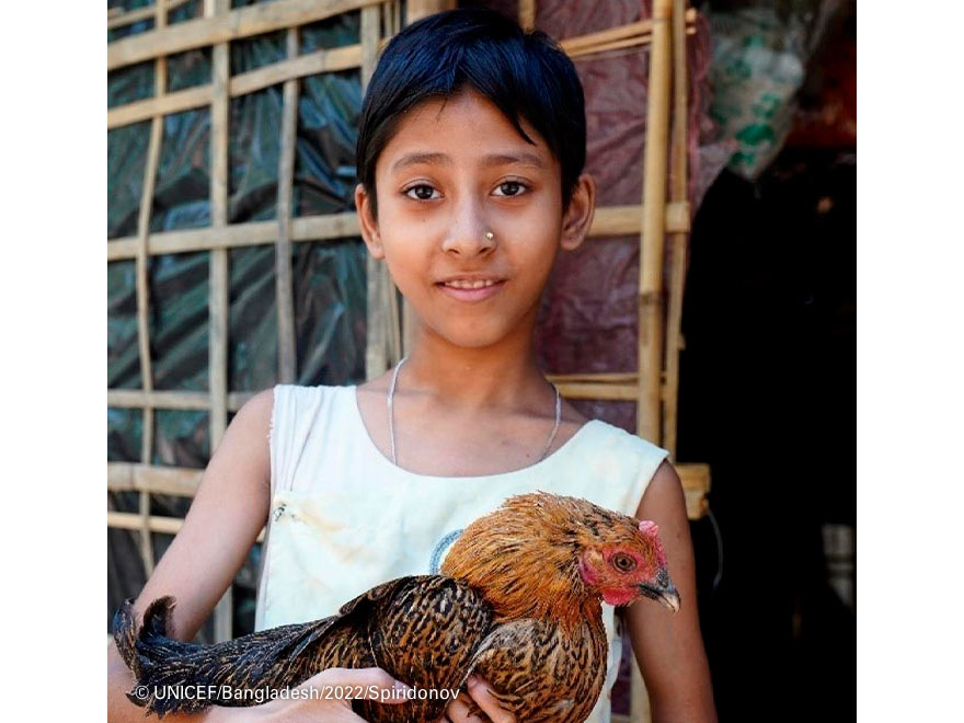 Aunque sigue enfrentándose a las dificultades de vivir en un campo de refugiados como Cox’s Bazar, ahora tiene una pequeña tienda hecha con ramas de bambú que le aporta los ingresos suficientes para salir adelante. Esta iniciativa de UNICEF le ha cambiado la vida, como ella misma nos explica: “He aprendido a preparar el alimento para las gallinas, a cuidarlas, a protegerlas de enfermedades y a ayudar a los pollitos a salir del cascarón”.