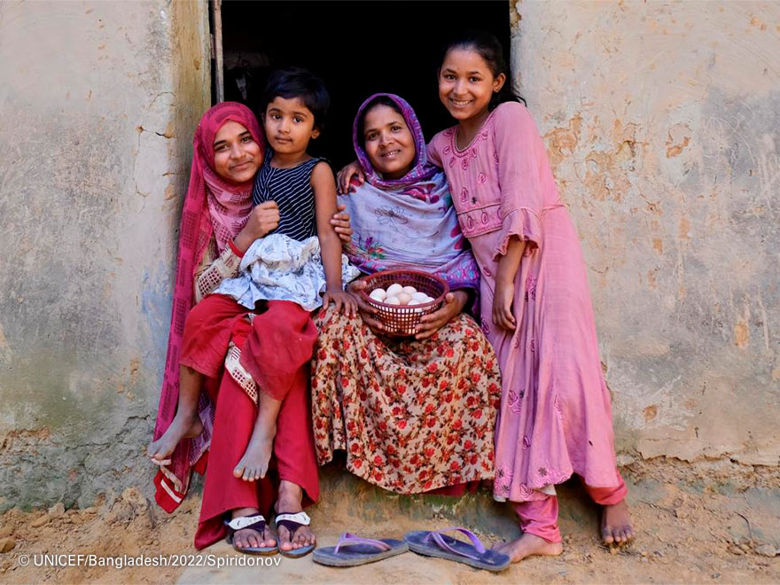 La desnutrición sigue siendo un problema de salud pública en Cox's Bazar, donde 25 de cada 100 niños no alcanzan la altura normal para su edad, y 10 de cada 100 niños están demasiado delgados para su altura. Las poblaciones vulnerables tienen serias dificultades para acceder a alimentos en la cantidad y calidad necesarias para satisfacer sus necesidades de calorías y nutrientes. Por eso Monjura nos dice que, aunque podría vender más huevos y ganar más dinero, prefiere guardárselos a sus hijas, ya que por primera vez tienen una fuente de proteínas a su alcance.