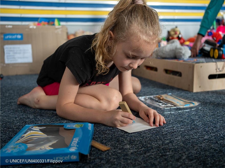 La pequeña Polina estrena el material escolar que le ha proporcionado UNICEF en el centro de acogida.