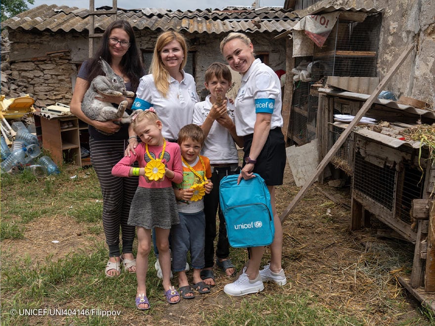 El equipo móvil de UNICEF posa junto a la familia de Anastasia.