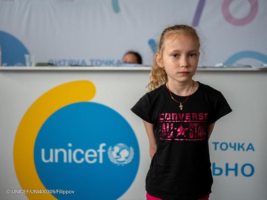 Polina y otros niños son recibidos en el centro de acogida de UNICEF.