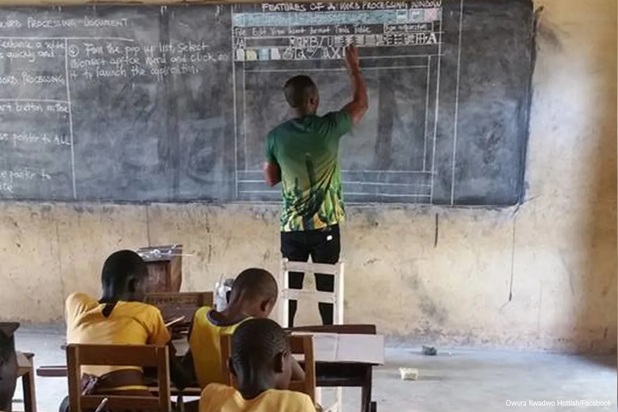 Esta foto, que se hizo viral hace un tiempo, muestra al profesor Owura Kwadwo, de Ghana, dibujando sobre la pizarra el interfaz de la aplicación MS Word para que la clase pueda entender el programa sin disponer de ordenadores. La foto, que el propio profesor compartió en Facebook, se han convertido en un símbolo de la brecha digital en educación y del esfuerzo que supone para muchos docentes educar en habilidades digitales sin disponer de medios tecnológicos. Foto: Owura Kwadwo