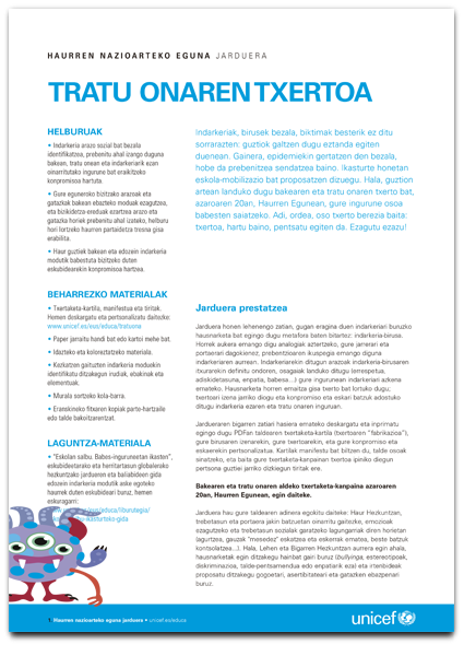 Hala, guztion artean landuko dugu bakearen eta tratu onaren txerto bat, azaroaren 20an, Haurren Egunean, gure ingurune osoa babesten saiatzeko. Adi, ordea, oso txerto berezia baita: txertoa, hartu baino, pentsatu egiten da. Ezagutu ezazu!