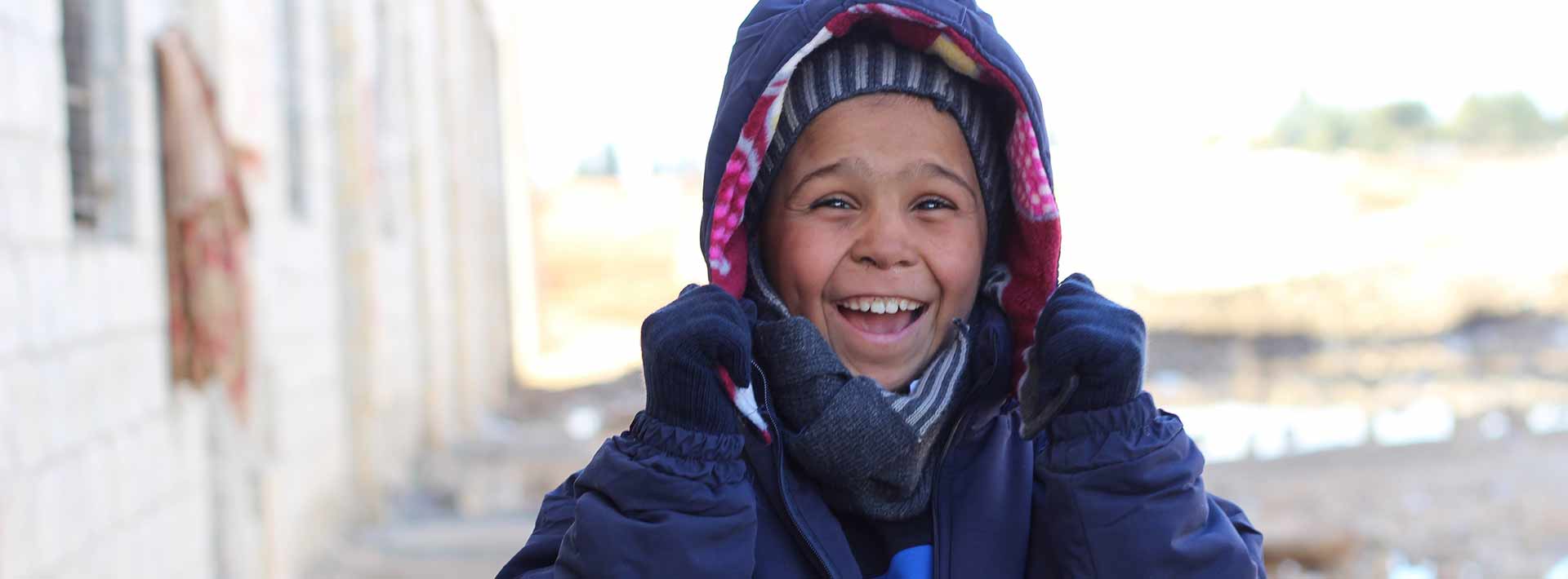 Diciembre de 2016. Ahmed despliega una sonrisa radiante cuando descubre que la ropa de invierno que le acabamos de entregar es justo de su talla. Tiene 10 años y vive junto a otras 6.200 personas desplazadas en un antiguo almacén industrial que ahora sirve de refugio en Jibreen, a las afueras de Alepo (Siria).