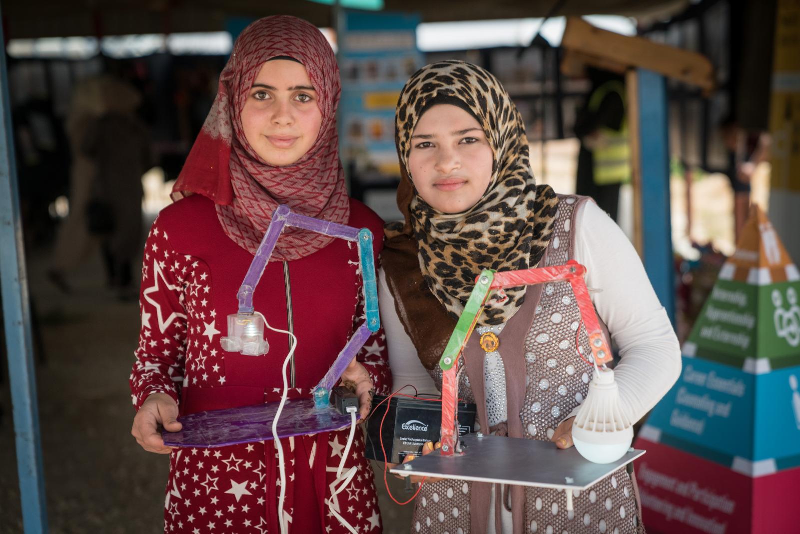 Anwar, de 14 años, y Dina, de 15, sostienen orgullosas su invento: una lámpara con batería para que los niños del campamento de refugiados de Za’atari, en Jordania, puedan hacer sus deberes cuando no haya electricidad. “Queremos que esté en todas las casas del campamento”, nos cuenta Dina tras presentar su idea en el Laboratorio de Innovación de UNICEF en Za’atari.