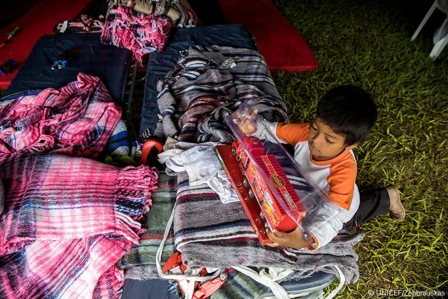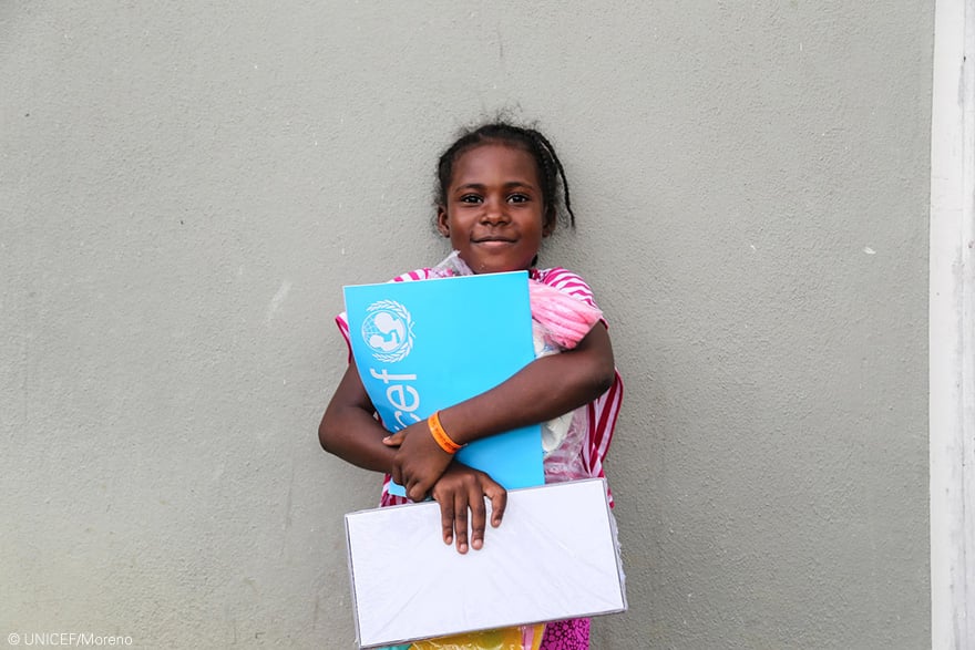 Irma será recordado por ser el huracán más poderoso jamás registrado en el Océano Atlántico, causando graves daños en las islas del Caribe Oriental, Haití y Cuba. La isla de Barbuda fue una de las más afectadas. Más del 90% de sus edificios fueron destruidos: casas, escuelas y el único hospital de la isla. Las primeras 48 horas después de una emergencia son vitales. Los centros de formación de Barbuda se convirtieron en refugios improvisados para las personas desplazadas que habían perdido sus hogares. Myra tiene 8 años y está feliz con los materiales educativos que ha recibido de UNICEF. Su peor pesadilla ha terminado y se siente segura junto a su familia.