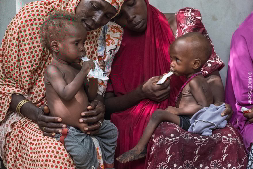 Usam tiene 16 meses y es uno de los 450.000 niños menores de cinco años que necesitan apoyo nutricional en Nigeria. A sus 33 años, Fátima, su madre, no tiene otra preocupación que la vida de su hijo. Mientras espera a ser atendida en la Clínica Dalaram en el Estado de Borno, en Nigeria, le suministra un sobre de alimento terapéutico para combatir la desnutrición aguda que padece. La crisis humanitaria en el noreste de Nigeria ha tenido un impacto devastador en la seguridad alimentaria y la nutrición de los niños. Durante 2017, hemos tratado a más de 178.000 niños con desnutrición aguda grave y no descansaremos hasta que todos la hayan superado