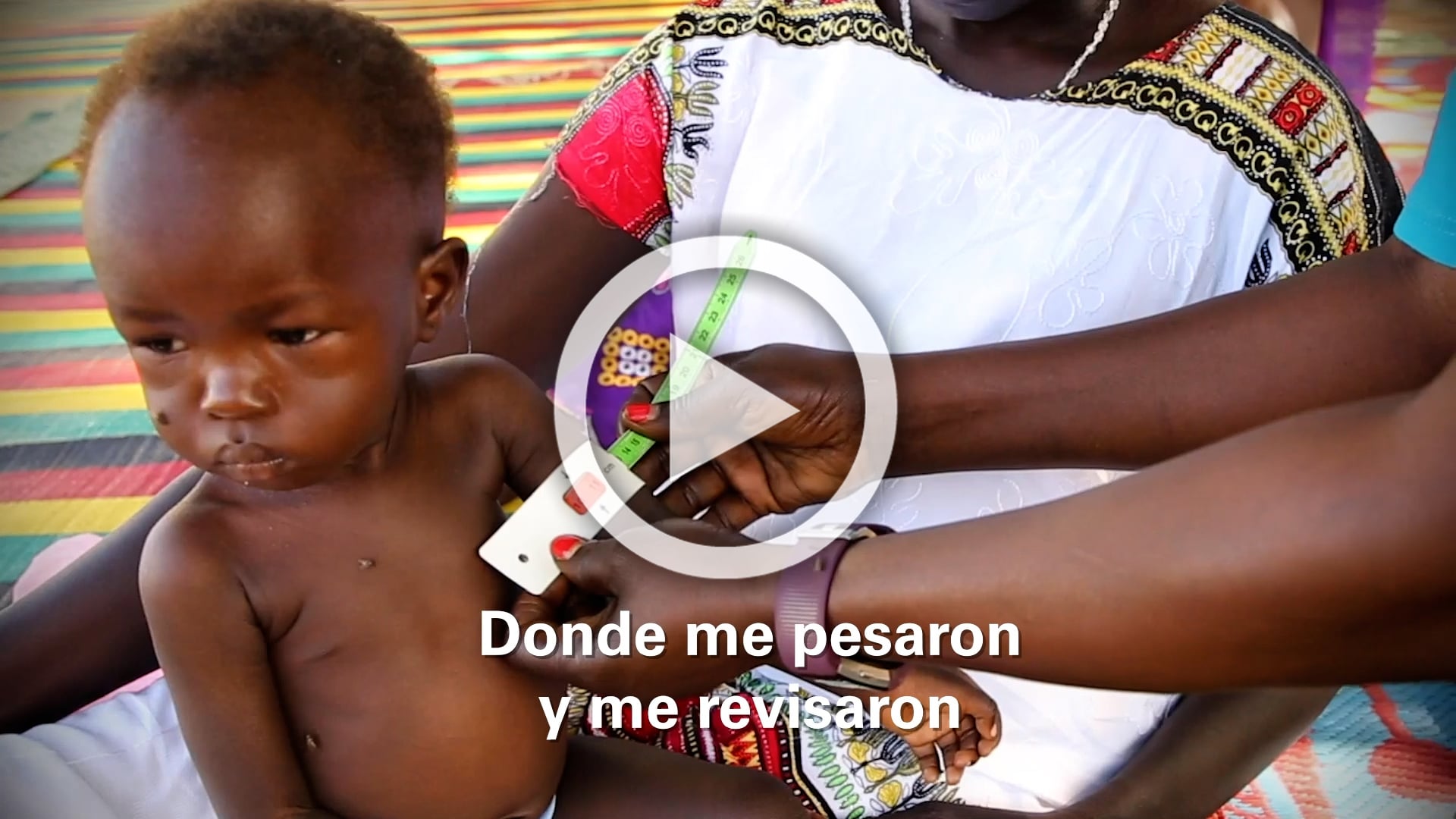 Preocupados por su estado de salud, los padres de Adut la llevan al centro más cercano a su pueblo en Aweil, noroeste de Sudán del Sur. Nuestra nutricionista, Jesca Wude, examina a Adut con delicadeza en busca de signos de desnutrición. Usa una cinta métrica especial, con la que mide la circunferencia de la parte superior de su brazo. Sale claramente el color rojo, lo que significa que tiene desnutrición grave. Cuando la suben a la balanza, apenas alcanza los 6,5 kilos, el peso que debería tener si tuviera 7 meses, no 14.