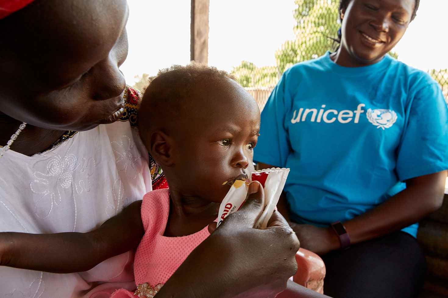 Adut empieza a recibir alimento terapéutico listo para su consumo durante tres veces al día. En UNICEF somos el mayor proveedor de alimento terapéutico. Proporcionamos entre el 75% y el 80% de los suministros mundiales. Se trata de una pasta de cacahuete enriquecida con vitaminas y minerales especialmente diseñada para el tratamiento infantil de la desnutrición aguda. Tiene un sabor dulce, lo que hace que sea más fácil de comer para niños como Adut, que a menudo no tienen mucho apetito.