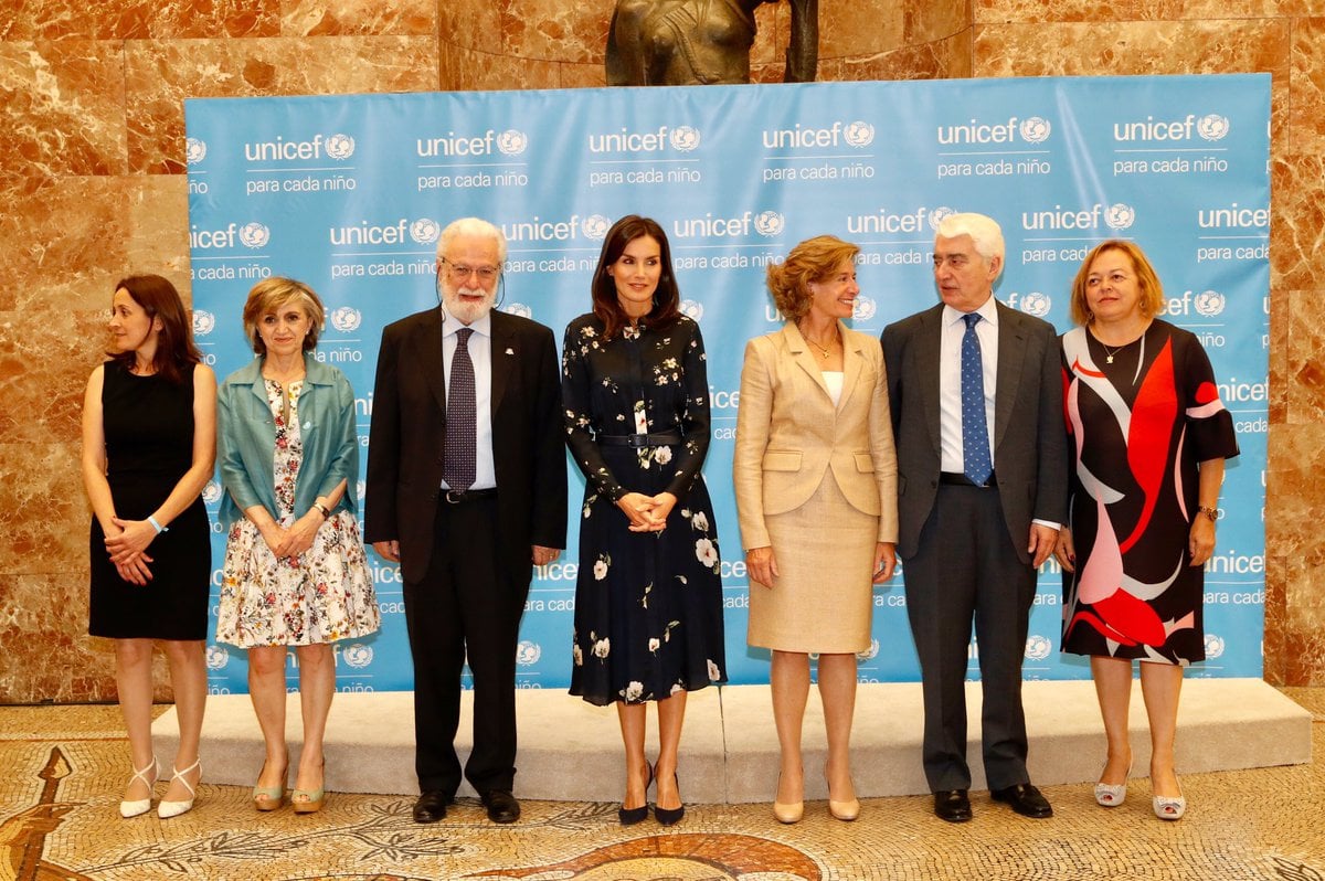 De izquierda a derecha: María Eulate, directora del programa 'Cinco Contienentes' de Radio 5 (RNE); la ministra de Sanidad, Consumo y Bienestar Social, María Luisa Carcedo; el pedagogo y pensador Francesco Tonucci; Su Majestad la Reina Doña Letizia, presidenta de Honor de UNICEF España; la presidenta de la Fundación Pablo Horstmann, Ana Sendagorta; el presidente de UNICEF España, Gustavo Suárez Pertierra y la presidenta del Consejo Superior de Investigaciones Científicas (CSIC), Rosa Menéndez. 11/06/2019