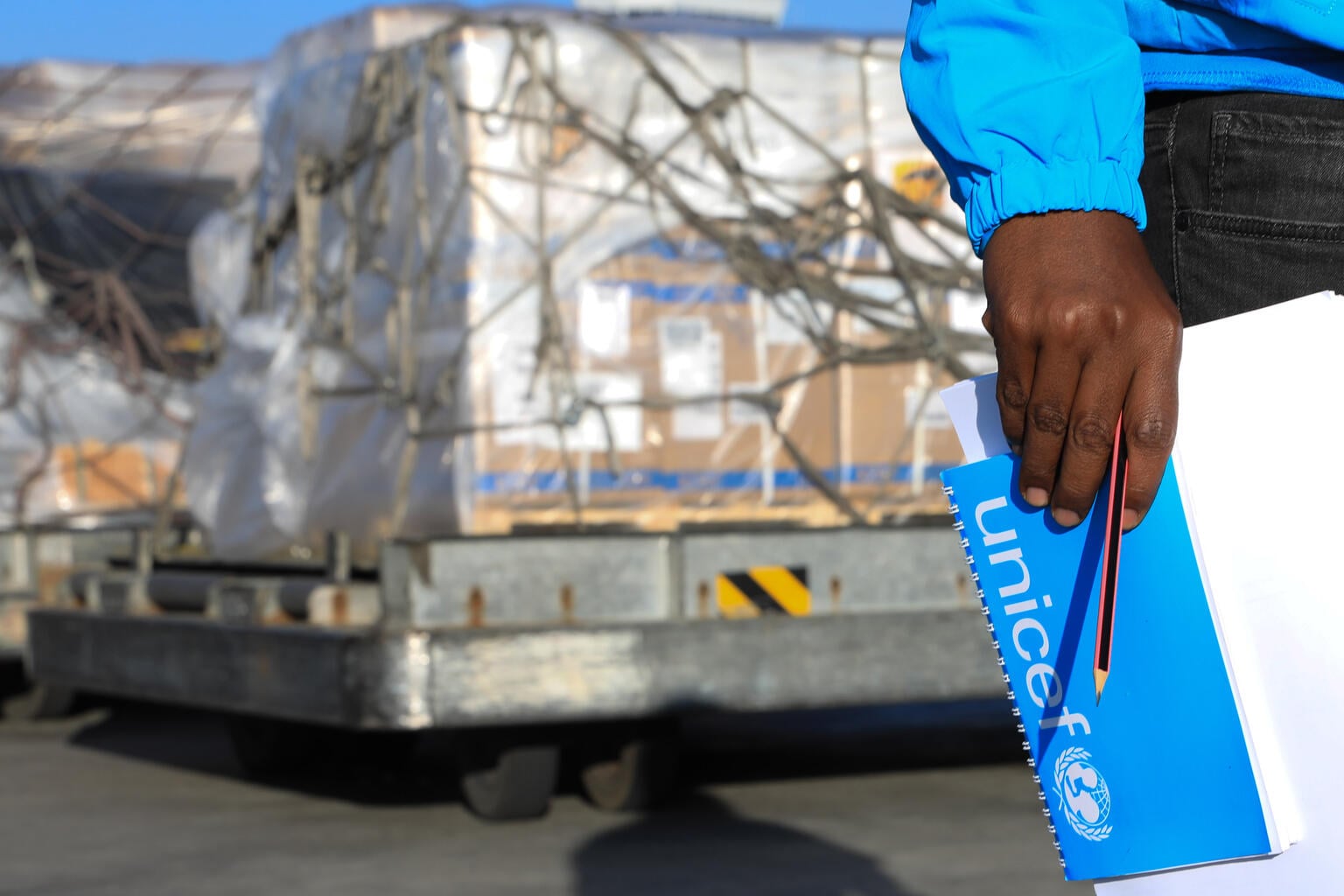 Un trabajador de UNICEF recibe suministros en un aeropuerto