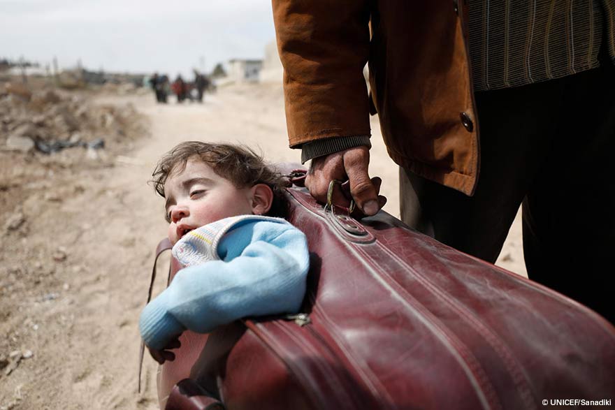 Hace apenas tres meses, en marzo de 2018, esta foto fue portada en todo el mundo. En Beit Sawa, al este de Ghouta, en Siria, que entonces cumplía 7 años de guerra, un hombre llevaba a su niño en una maleta caminando hacia Hamourieh, donde se había abierto una salida de evacuación. No era la primera vez que una imagen así conmocionaba al mundo: Aylan, Omran...