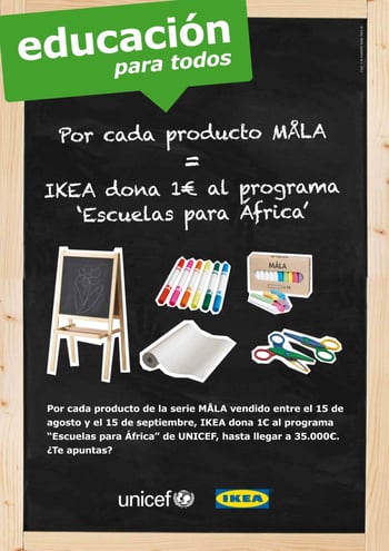 UNICEF España e Ikea han puesto en marcha, por segundo año consecutivo, la campaña Educación para todos. Entre el 15 de agosto y el 15 de septiembre, por cada producto vendido de la serie MALA, Ikea donará 1 euro a Escuelas para África, una iniciativa de UNICEF, la Fundación Nelson Mandela y la Sociedad de Hamburgo, que persigue la escolarización de ocho millones de niños en once países africanos de aquí a 2013.