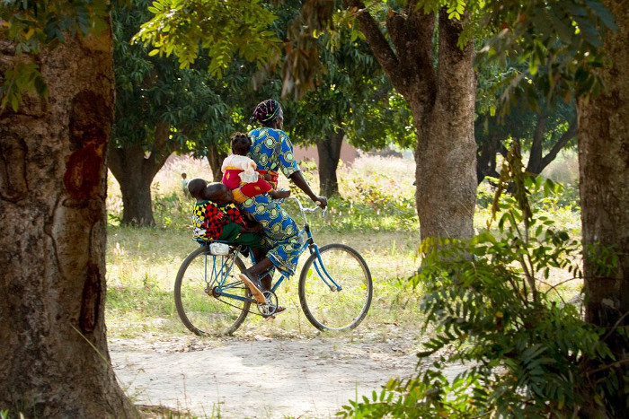 Fatimata Dembelé y sus tres hijos se desplazan hasta el Centro de Desarrollo de la Primera Infancia de Sokoroni en una de las bicicletas que UNICEF ha entregado.