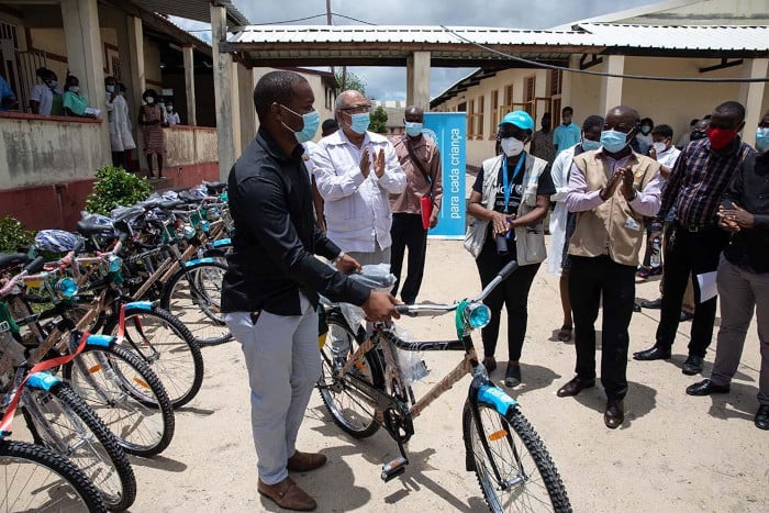 Dezi Mahotas, nuestro especialista en salud, distribuye estas bicicletas adquiridas por UNICEF al Centro de Salud Ponta Gêa, provincia de Sofala, en Mozambique.