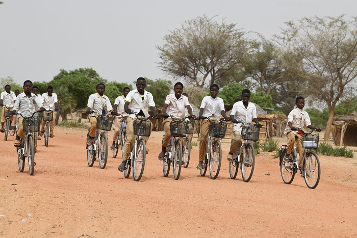 Los niños y niñas en el pueblo de Gangara, en el centro de Níger, van en sus nuevas bicicletas a la escuela.