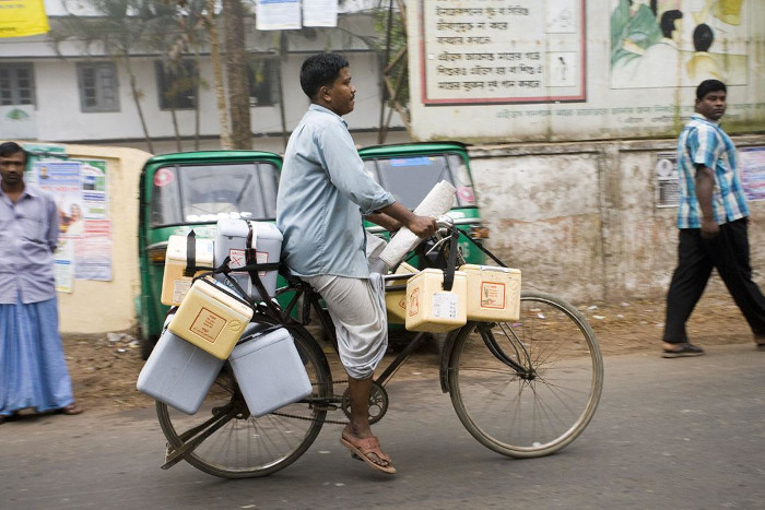 Porter Mohammed Abu Taher utiliza una bicicleta para transportar una buena cantidad de refrigeradores con vacunas contra el sarampión a un punto de distribución en el centro de salud del subdistrito de Boalkhali, Chittagong.