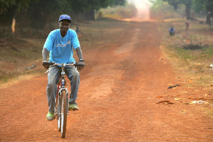 Giscard Zackondo, trabajador de extensión comunitaria, conduce una bicicleta entregada por UNICEF hacia un puesto de salud en el pueblo de Bobua, provincia de Lobaye, República Centroafricana.