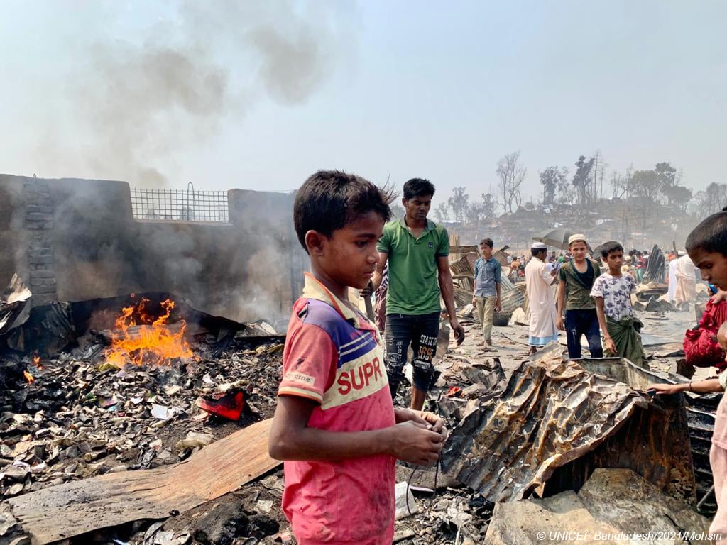 Se acumulan las calamidades para los niños rohingyas y sus familias en los campamentos de refugiado de Cox’s Bazar, Bangladesh. Un incendio declarado esta semana ha causado una enorme devastación, destruyendo más de 10.000 viviendas y algunas escuelas temporales, y desplazando a más de 45.000 personas —la mitad de ellas niños y niñas—.
