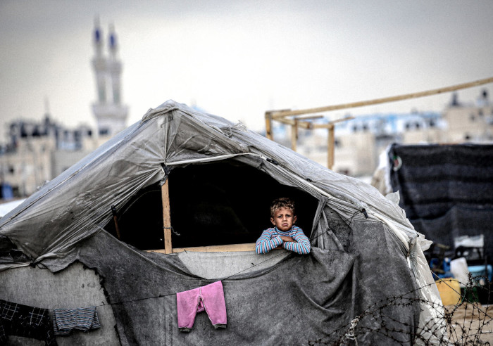 Un niño se asoma desde su refugio improvisado construido con madera y plástico, donde las familias desplazadas han buscado seguridad en Rafah, al sur de la Franja de Gaza. © UNICEF/UNI820856/