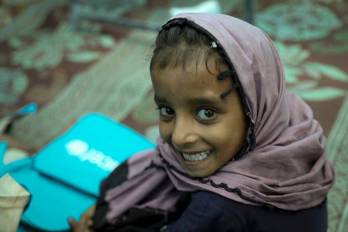 En una escuela temporal apoyada por UNICEF, Bena, de 6 años, contenta porque vuelve a clase. © UNICEF/UN0728306/Zaidi