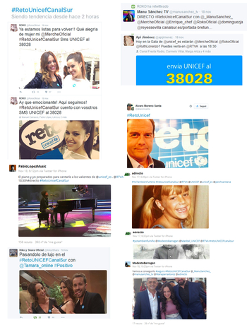 Con su ayuda y la de miles de seguidores que retuitearon mensajes y vídeos, el hashtag #retoUNICEFcanalsur fue Trending Topic (TT) nacional desde el inicio de la gala hasta después de su conclusión.
