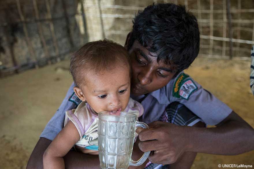 En UNICEF trabajamos con nuestros aliados para ofrecer servicios prenatales y postnatales a las madres rohingya y sus bebés. Trabajadores sociales visitan a las madres con frecuencia en sus viviendas para valorar su situación y derivarles a otros servicios si asó lo necesitan. Esta red cuenta de momento con más de 150 grupos de padres y madres en los campamentos.
