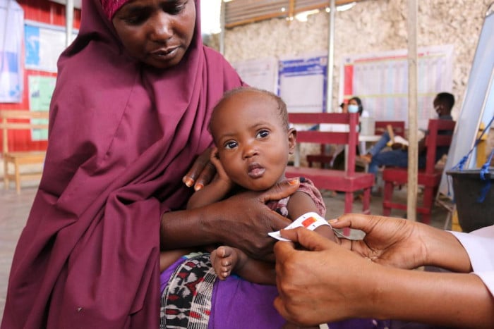 Una trabajadora mide la circunferencia superior del brazo de Sabirin para detectar su estado de nutrición. © UNICEF Somalia/Said