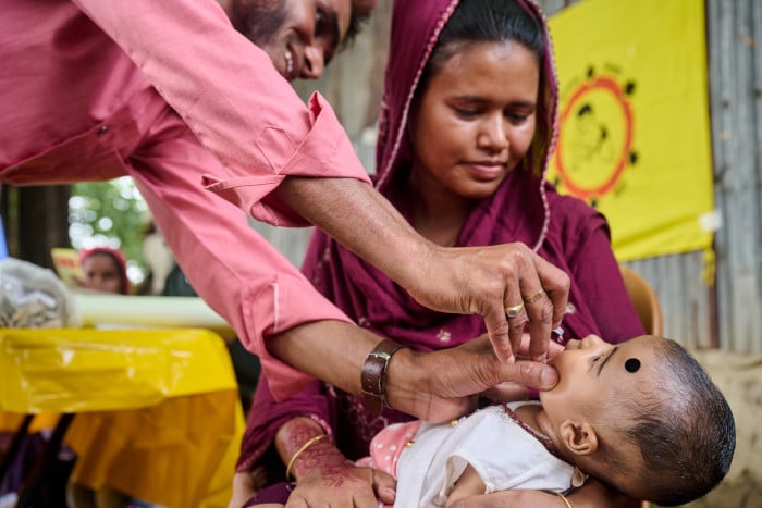 Un vacunador administrando a un bebé la dosis antipoliomielítica. Su dedicación contribuye a proteger la salud de los más pequeños de la comunidad. En Tahirpur (Bangladesh), un lugar remoto y de difícil acceso, la intervención de UNICEF es crucial para superar las barreras a la atención médica, en particular la vacunación sistemática. Nuestro apoyo permite a los trabajadores sanitarios identificar y vacunar a los niños y niñas más vulnerables. © UNICEF/UNI561960/Sujan
