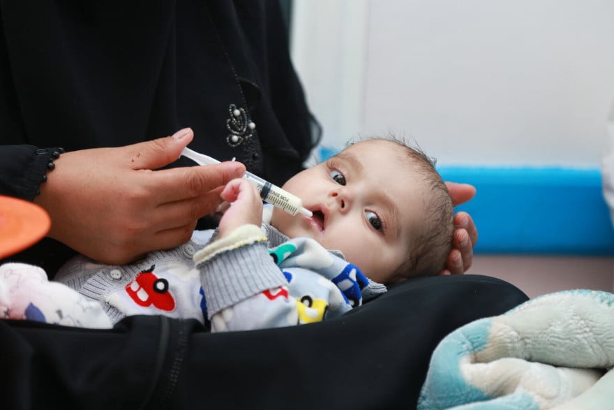 Un bebé en un centro de tratamiento contra la desnutrición en Yemen.
