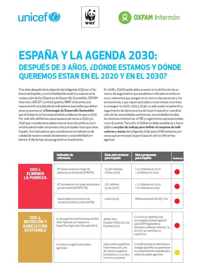 Tres años después de la adopción de la Agenda 2030 por el Gobierno de España, y con la finalidad de medir los avances en la consecución de los Objetivos de Desarrollo Sostenible, Oxfam Intermón, UNICEF España y WWF ofrecemos una nueva versión actualizada de indicadores esenciales que deben estar presentes en la Estrategia de Desarrollo Sostenible que el Gobierno se ha comprometido a elaborar de aquí a 2020.