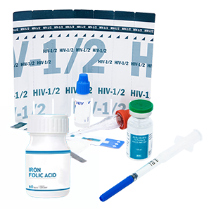 Este kit incluye 1 kit de obstetricia, 5 dosis de tratamiento contra la meningitis neonatal, 100 pastillas de suplemento de hierro y ácido fólico y 100 vacunas DTP (tos ferina, tétanos y difteria). Todos estos suministros sirven para cuidar a las mujeres embarazadas y lograr que sus bebés crezcan sanos.