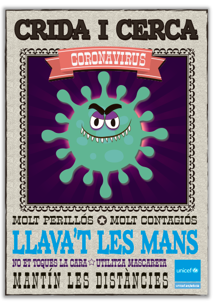 Com si d'un malfactor de l'salvatge Oest es tractés, el coronavirus SARS-CoV-2 és el protagonista d'aquest cartell, que pot donar suport els nostres esforços per difondre missatges d'higiene i prevenció en el centre educatiu. El PDF de descàrrega inclou a més una versió per pintar i que cada grup pugui personalitzar el seu cartell.